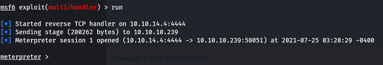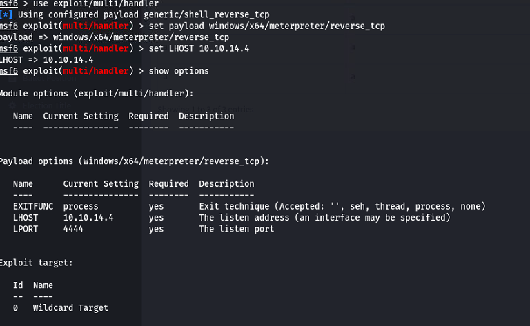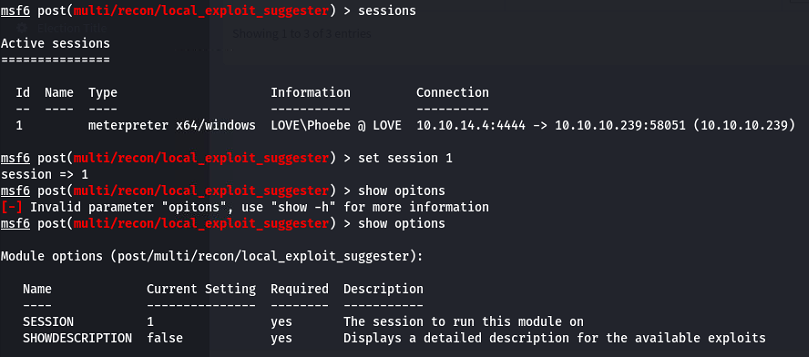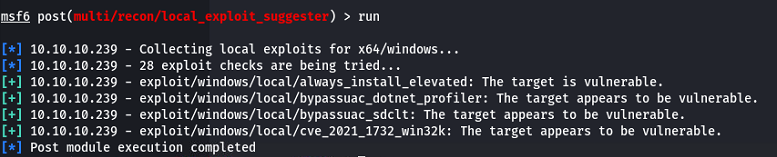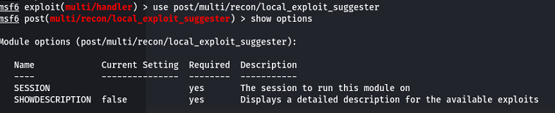 그리고 메타스플로잇에서 핸들링으로 미터프리터를 연결한 뒤 suggester를 돌려 취약점을 탐지 할 것이다.