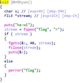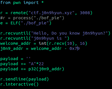 그러면 프로그램을 실행할 때 마다 바뀌는 welcome주소를 가지고 -0x79 하면 j0n9hyun함수의 위치가 된다.