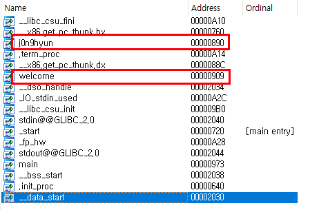 이번엔 welcome과 j0n9hyun 함수의 offset을 구해보자.