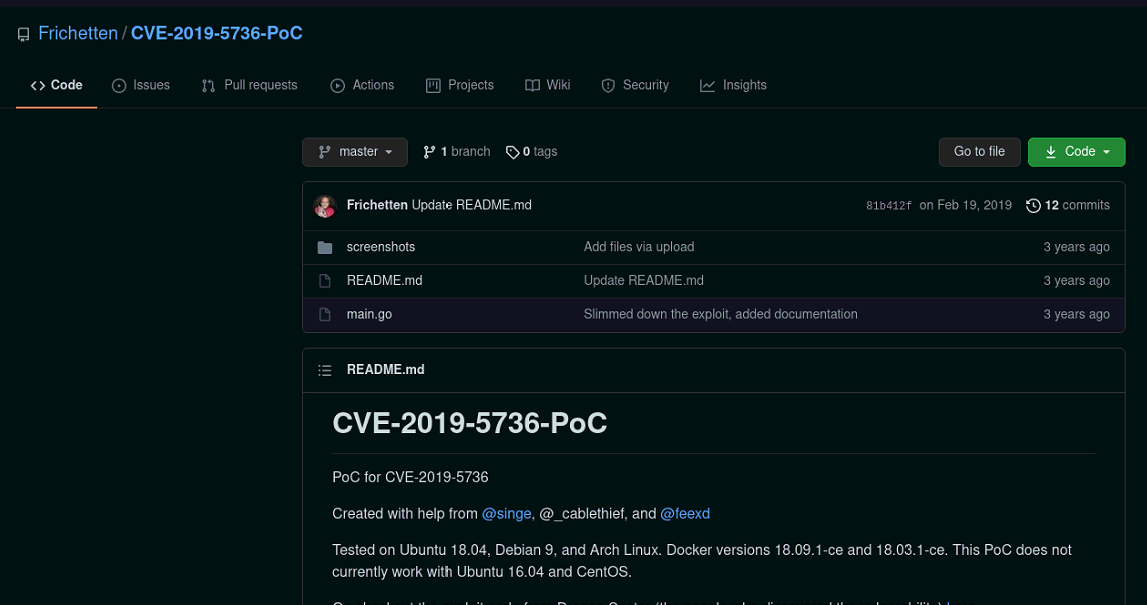 Docker exec exploit github로 검색해보니 다음과 같은 cve exploit 코드가 나왔다.. 한번 보자.