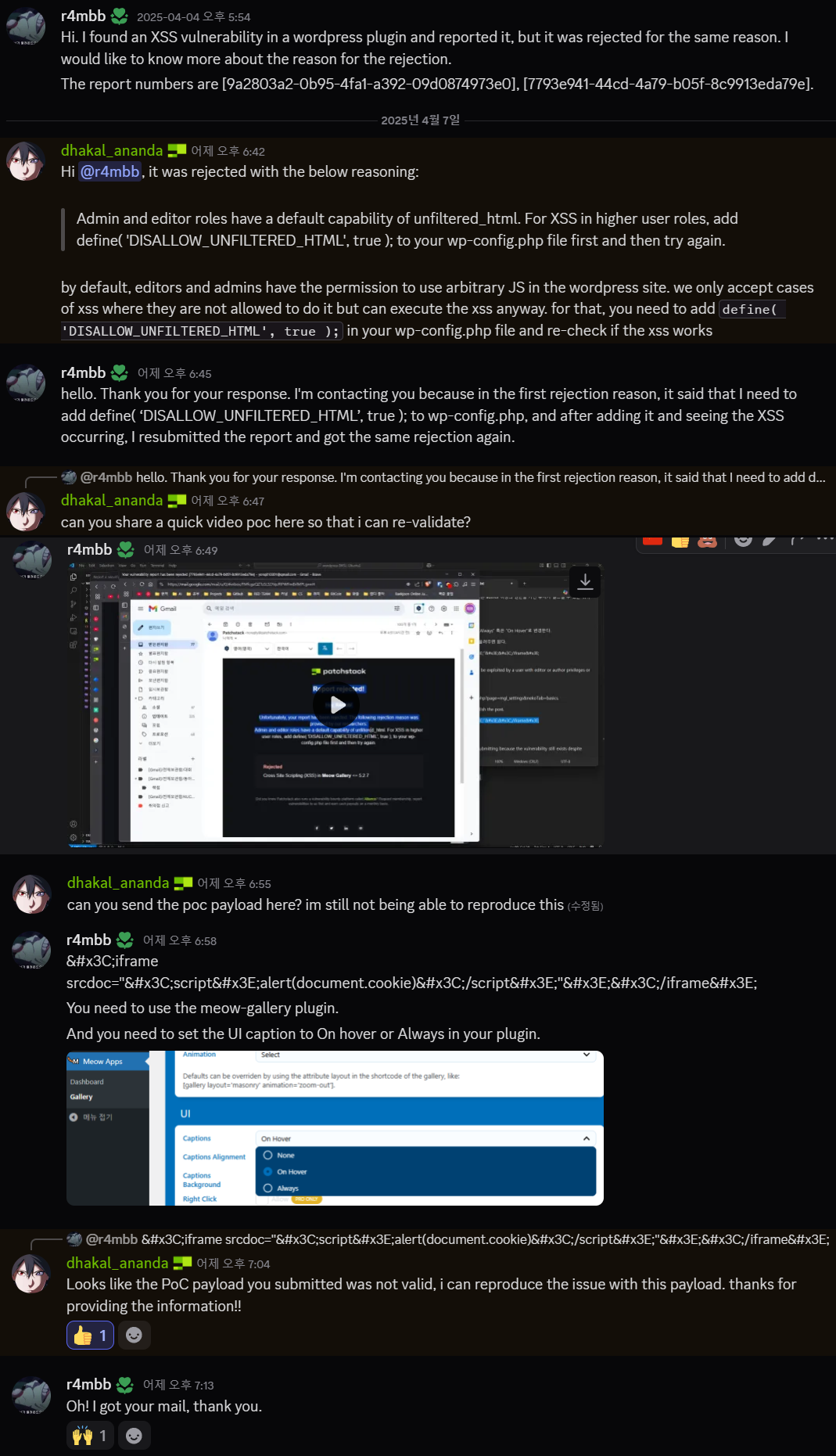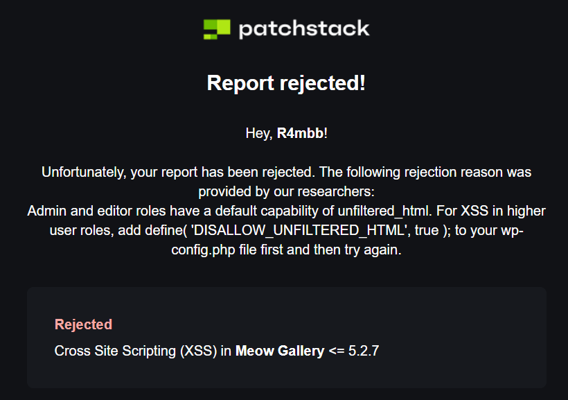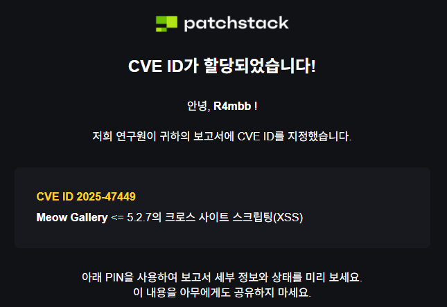 발견한 취약점은 CNA인 PatchStack에 리포트를 제출 했고, 현재 결과를 기다리는 중이다.